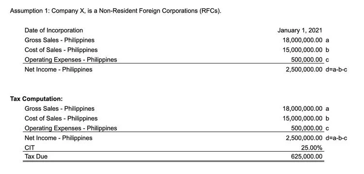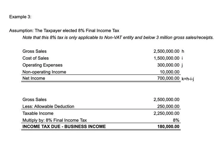 Example 1: Domestic Corporations with Net Taxable Income not exceeding Php 5M and/or total assets not exceeding Php 100M