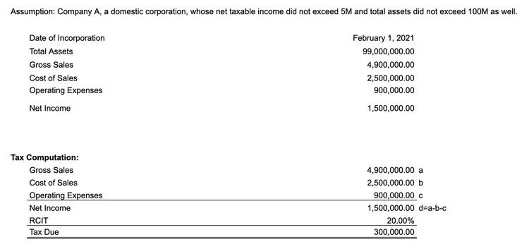 Assumption: Company A, a domestic corporation, whose net taxable income did not exceed 5M and total assets did not exceed 100M as well.